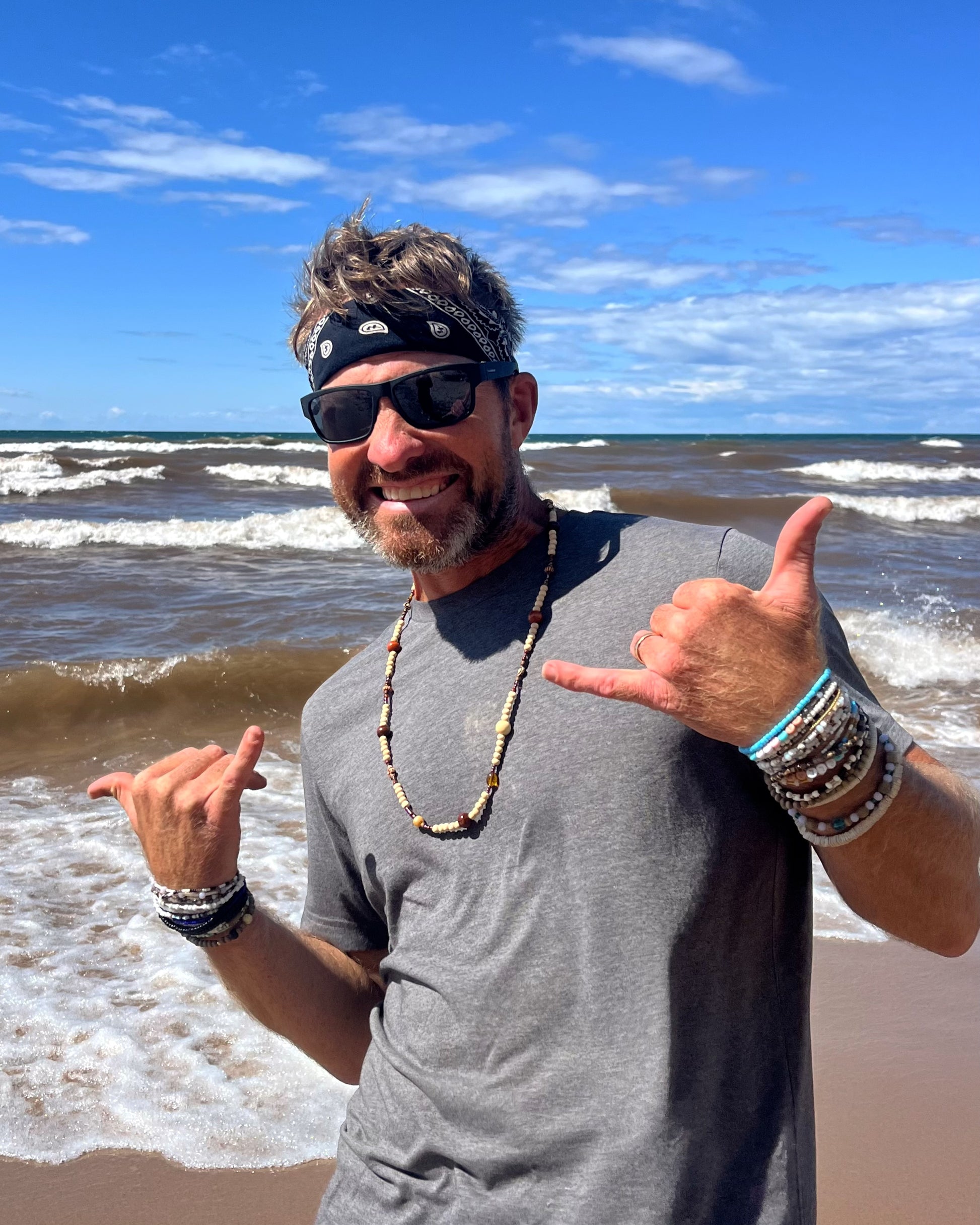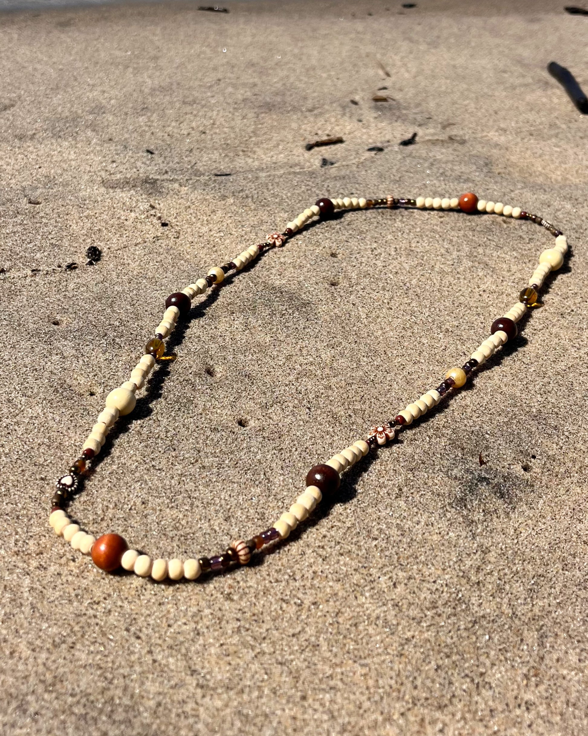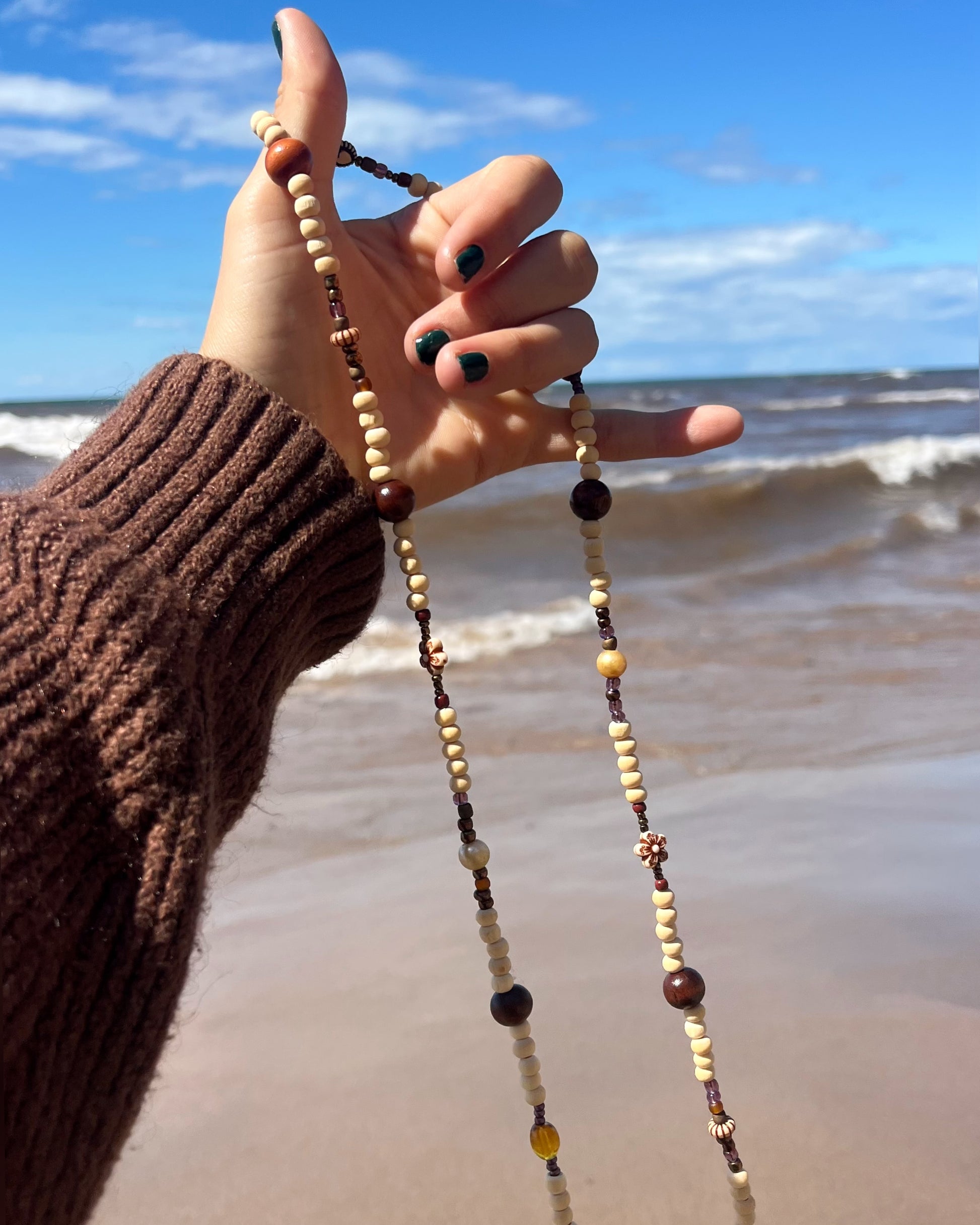 A 32-inch clasp necklace made with light wooden beads and accented with bronze browns and tiny creative details like flowers and unique charms. Inspired by the essence of fall, this long earthy piece captures the warmth and beauty of fallen oak leaves and autumn days.