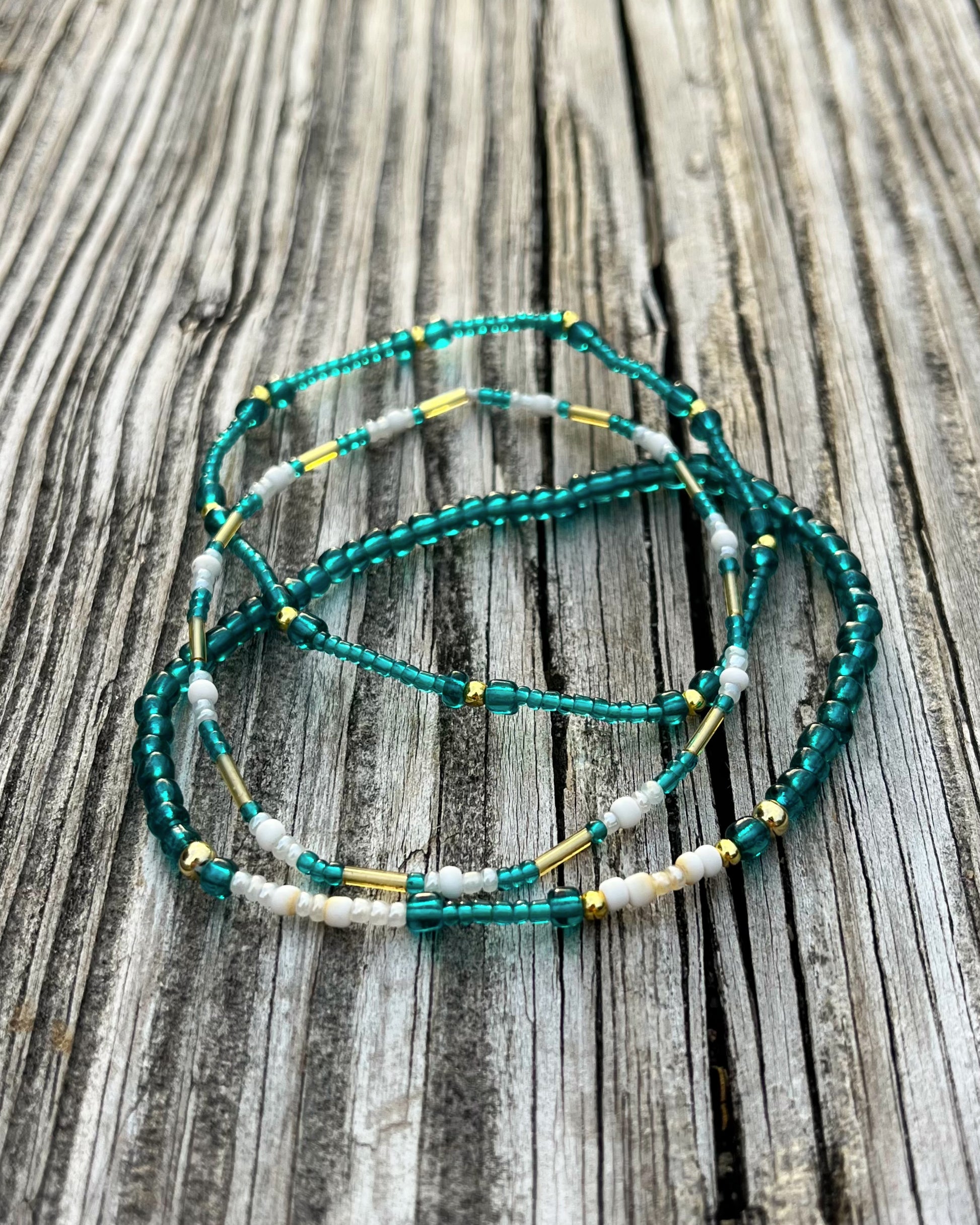 Set of three elastic beaded anklets in deep teals, with touches of white and gold. Perfect for layering and adding a seaside vibe to your look.