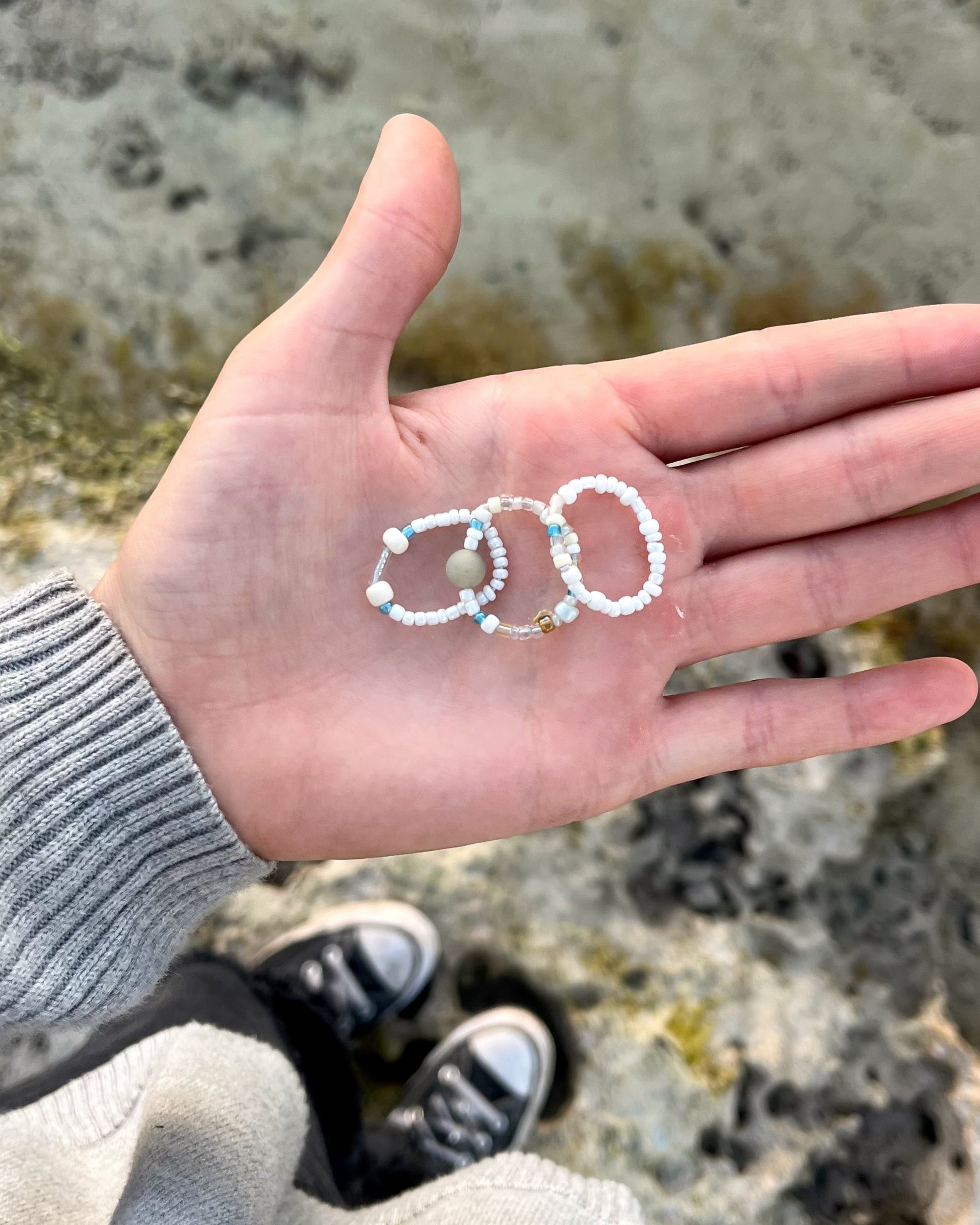 Set of 3 elastic beaded rings in soft gray and pale blue, each featuring a small sea stone bead. Inspired by the calm, misty tone of the sea.