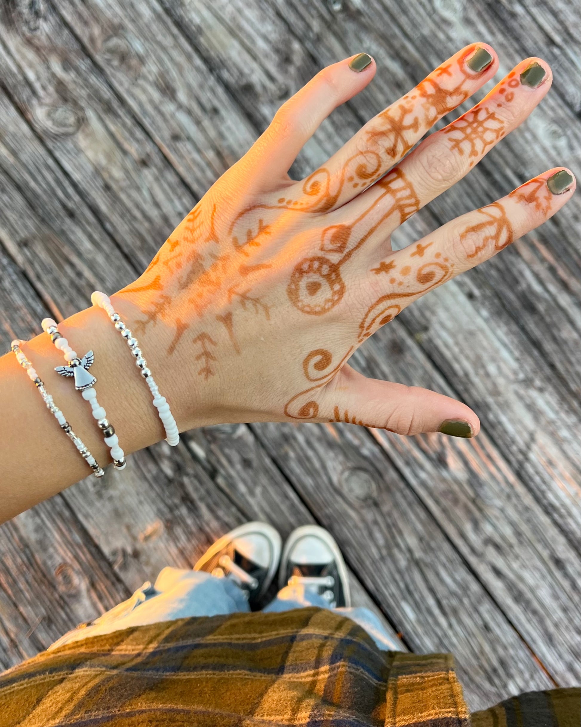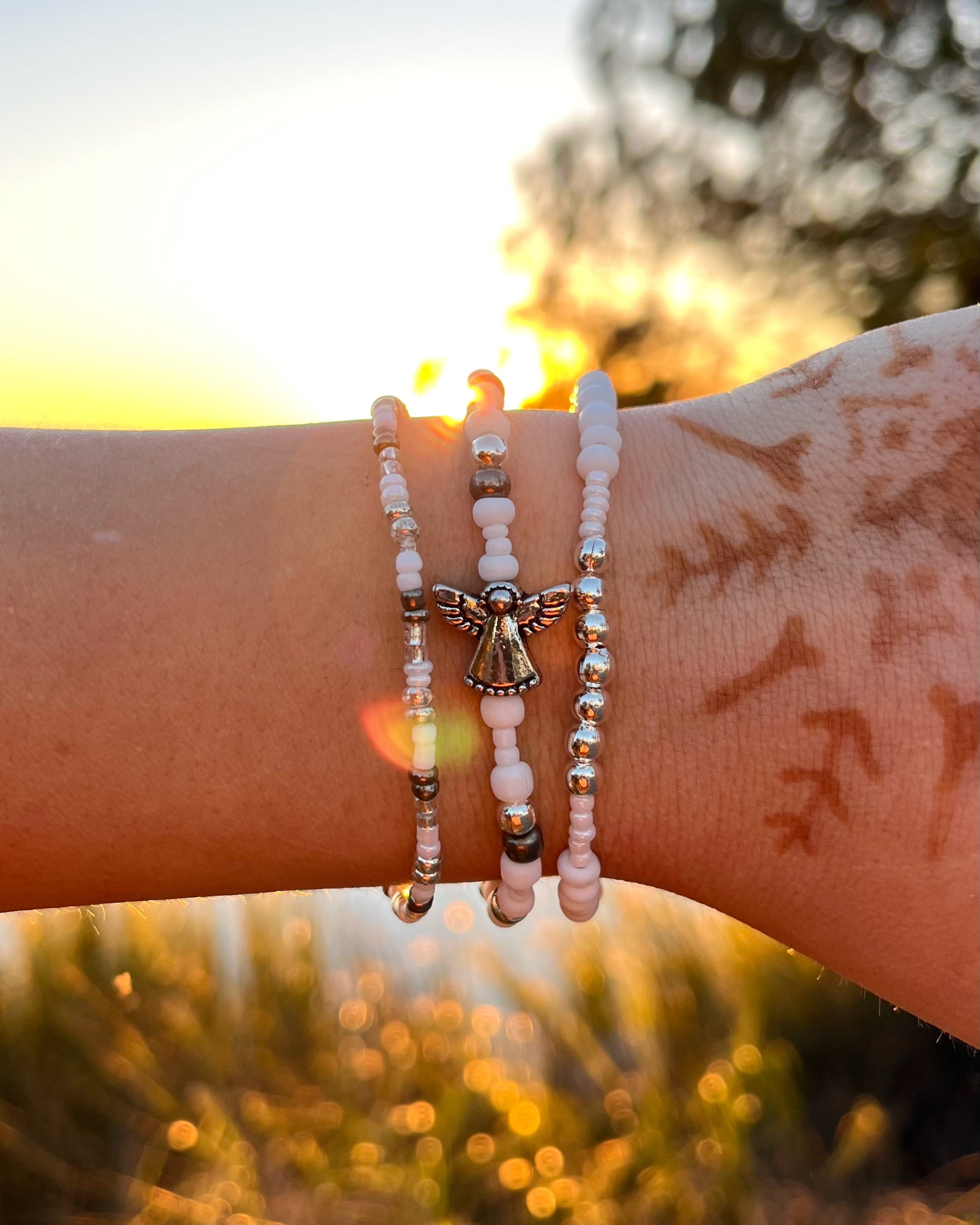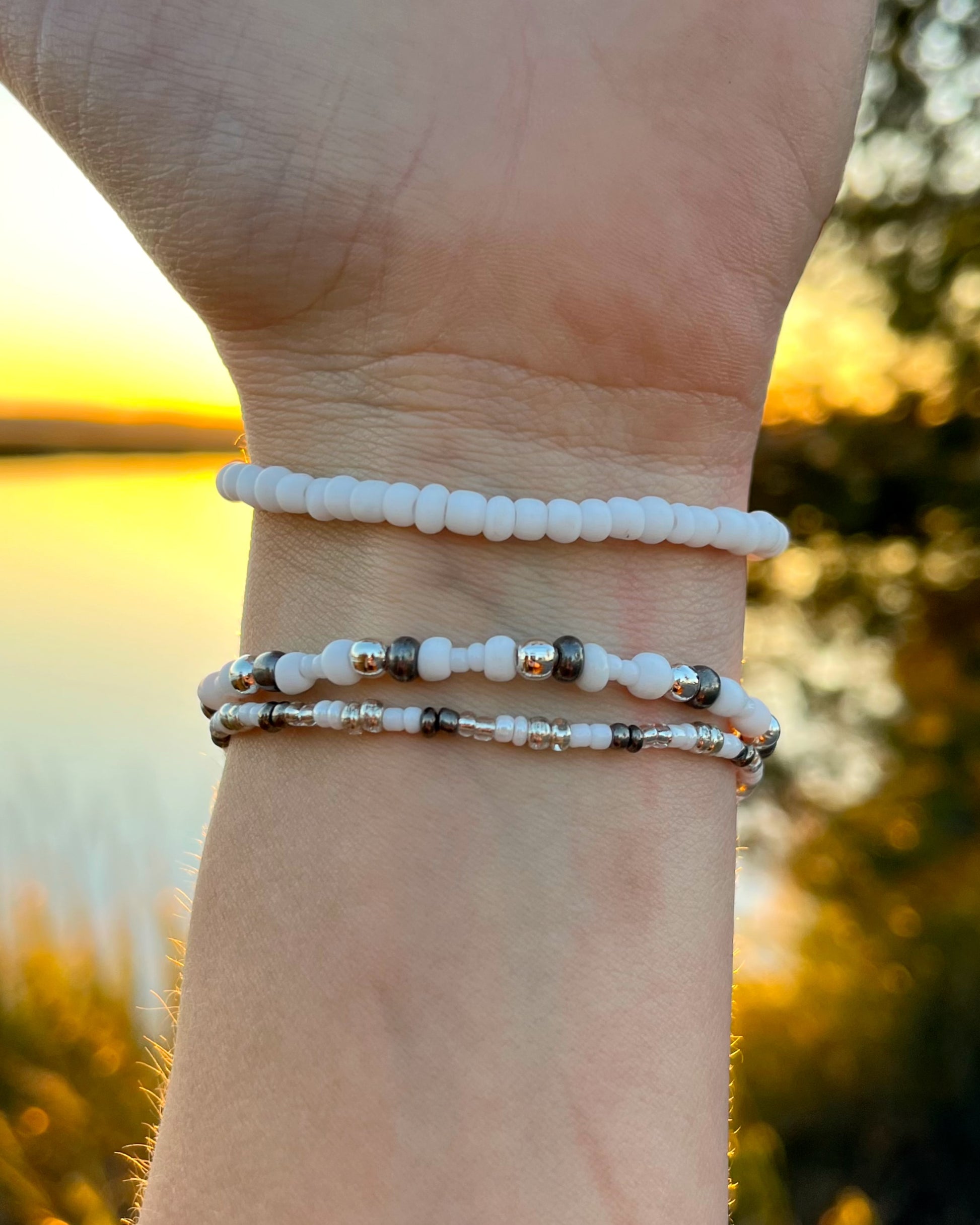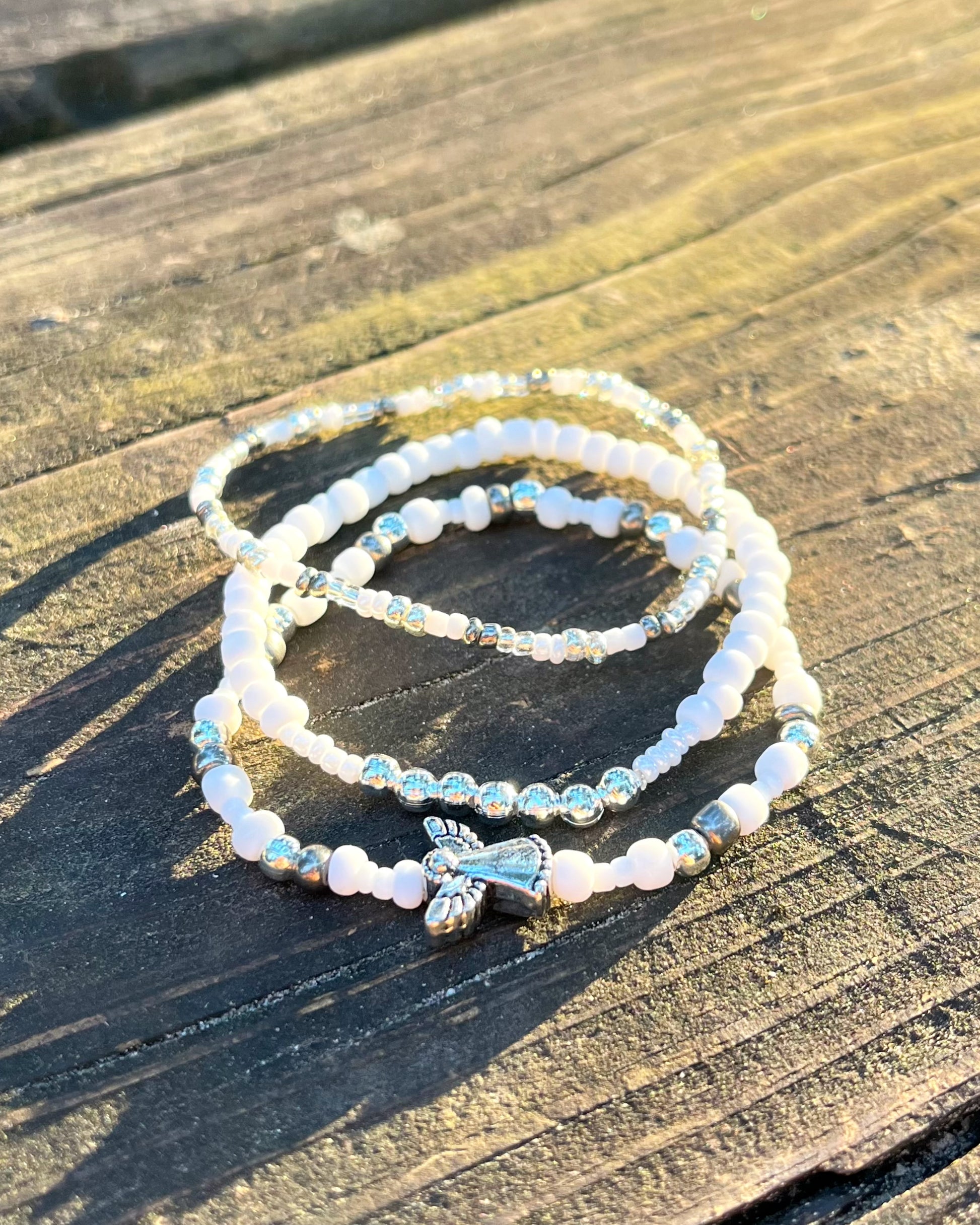 Three elastic beaded bracelets in cool whites and silvers, inspired by snow angels and the miracles of Christmas.